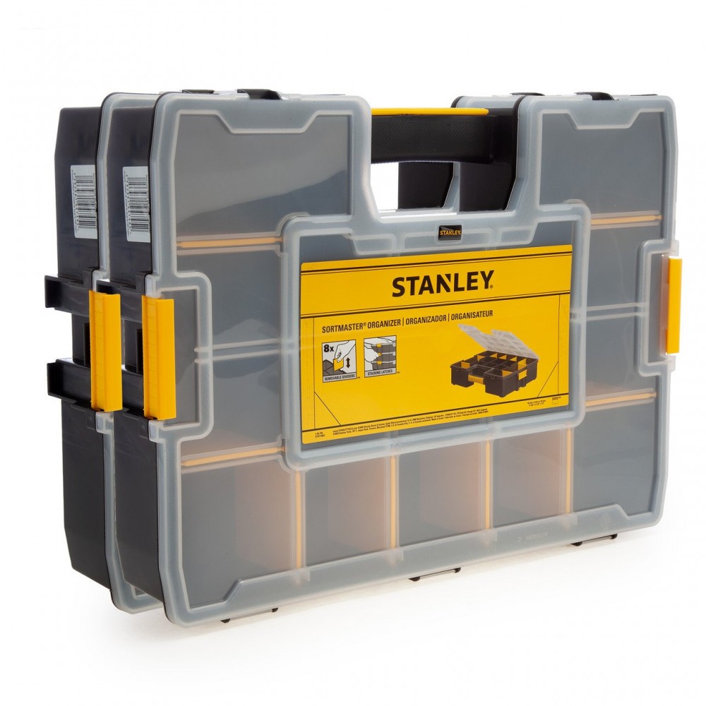 Stanley 1-95-839 yra dviejų Sortmaster Organiser rinkinys, skirtas tvarkingai laikyti smulkius įrankius ir priedus vienoje vietoje. Dangtis užtikrina, kad smulkios detalės neišsibarstytų iš skyrių, todėl viskas lieka tvarkinga. Organizatoriai yra tvirti, pagaminti be metalinių dalių, todėl nėra rūdijimo pavojaus, atlaiko darbo vietos smūgius.