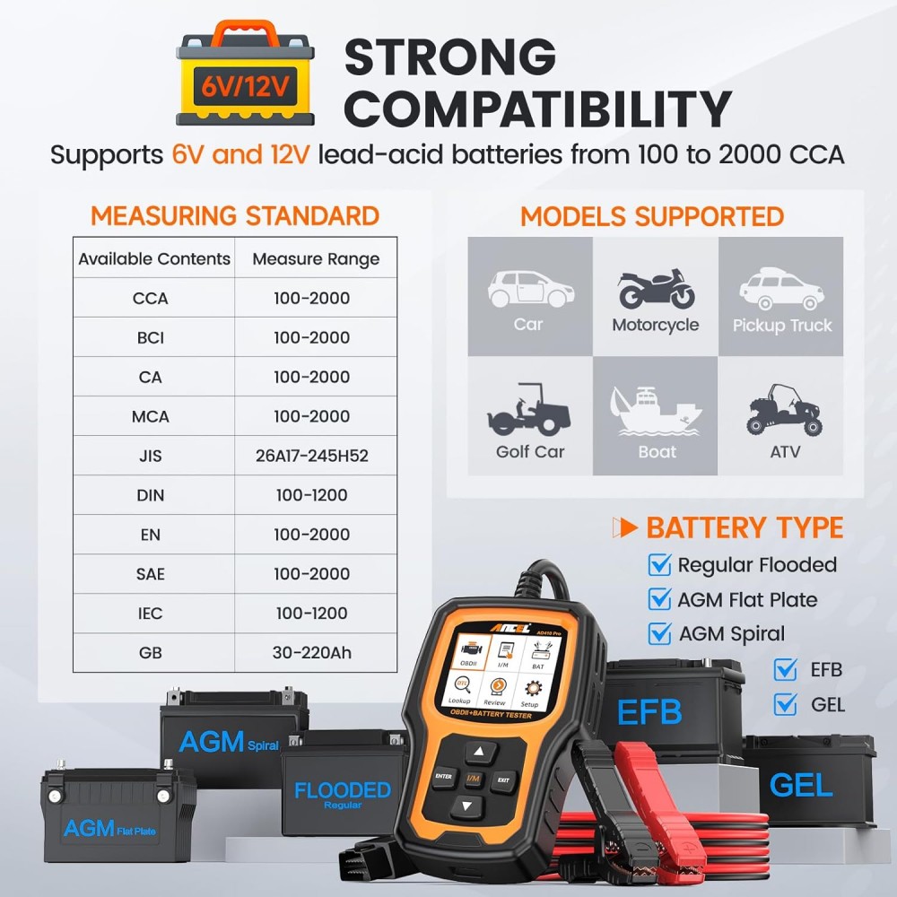 Patobulinta AD310 ir AD410 versija, AD410 PRO yra visapusiškas įrankis, palaikantis 6V ir 12V švino-rūgštinius akumuliatorius (nuo 100 iki 2000 CCA). Įrenginys ne tik testuoja akumuliatoriaus būklę, bet ir atlieka variklio diagnostiką, starterio testą bei įkrovimo sistemos analizę. Puikiai tinka tiek profesionalioms autoservisų dirbtuvėms, tiek automobilių entuziastams namuose. Suderinamas su AGM, GEL ir įprastais akumuliatoriais (flooded), naudojamais automobiliuose, motocikluose ir kt.
