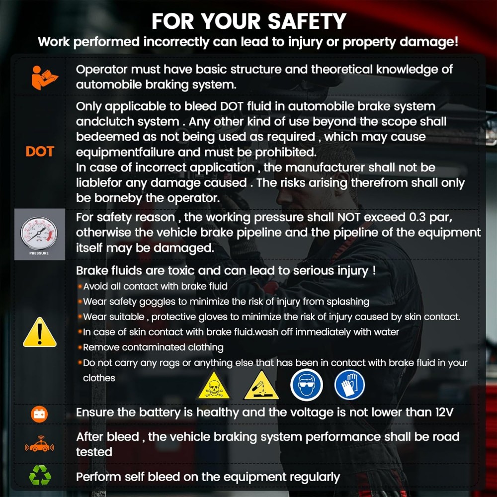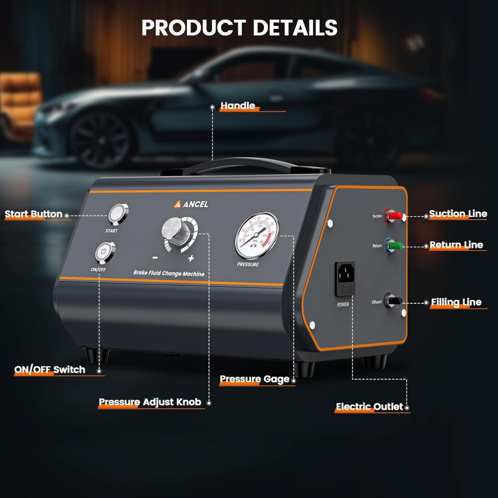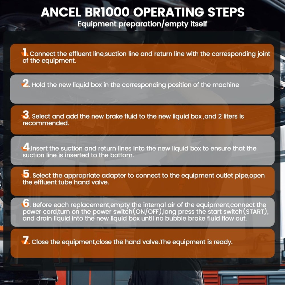 - Skirtingai nuo tradicinių rinkinių, ANCEL BR1000 stabdžių skysčio nuleidimo rinkinys naudoja pertraukiamo skysčio srauto metodą, kuris pašalina iki 99% oro burbuliukų ir išplauna nešvarumus iš stabdžių linijų bei ABS siurblio. Be to, išorinis saugiklis saugo pagrindinę plokštę ir komponentus, užtikrindamas saugų naudojimą.