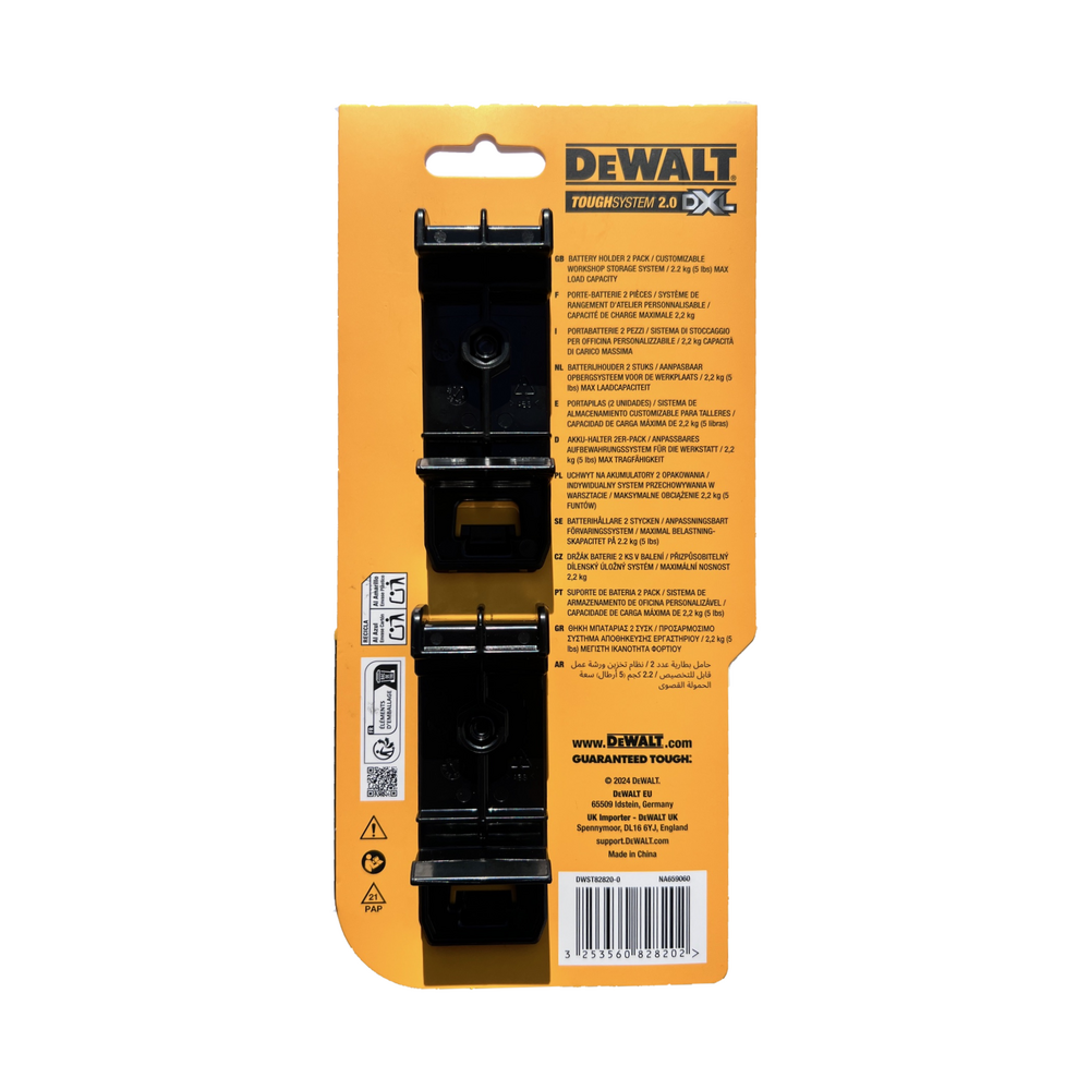 DeWALT DWST82820-0 – tai 2 akumuliatorių laikiklių rinkinys, priklausantis ToughSystem 2.0 DXL įrankių laikymo sistemai. Šie laikikliai leidžia patogiai ir saugiai pritvirtinti DeWALT 12V XR, 18V XR bei FLEXVOLT XR serijų akumuliatorius ant bėgių, dėžių šonų ar tiesiai prie sienos.