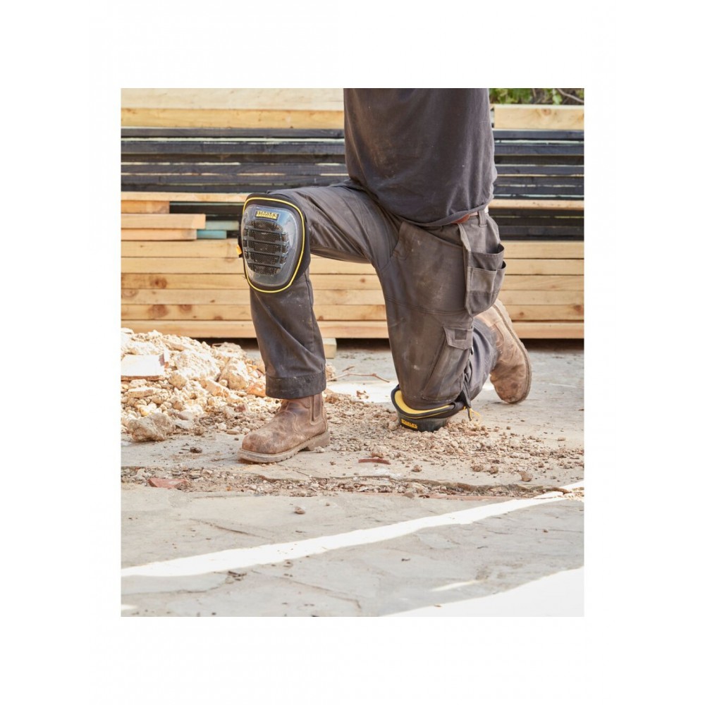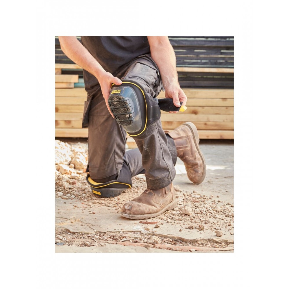 FMST82960-1 Stanley FATMAX kelių apsaugos su geliu sukurtos profesionaliam naudojimui, siekiant maksimalaus komforto ir apsaugos dirbant klūpant ar ropojant. Jų formuotas putplasčio ir gelio įdėklas apgaubia kelius, suteikdamas tvirtą atramą bei sumažindamas spaudimą. Pusiau standus TPE dangtelis užtikrina stabilumą ir neslydimą ant įvairių paviršių, o ypač platus neopreno dirželis leidžia apsaugas patogiai pritaikyti net mūvint pirštines.