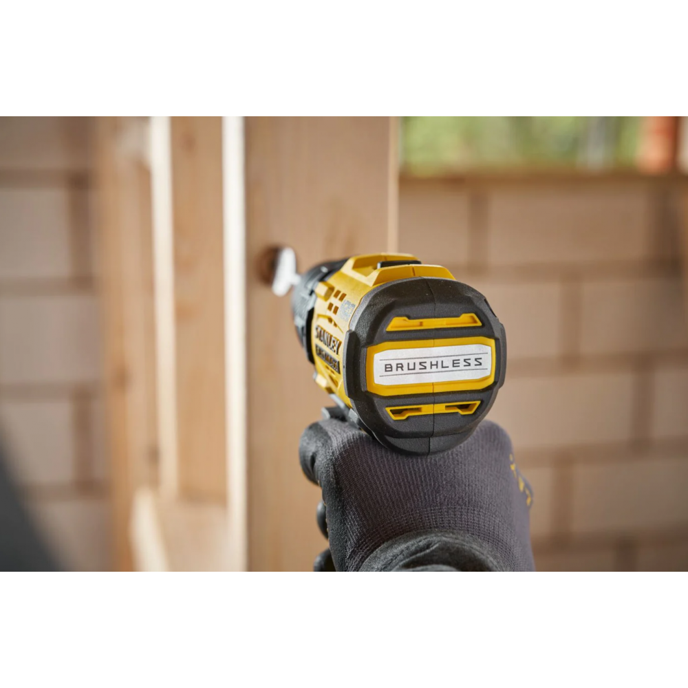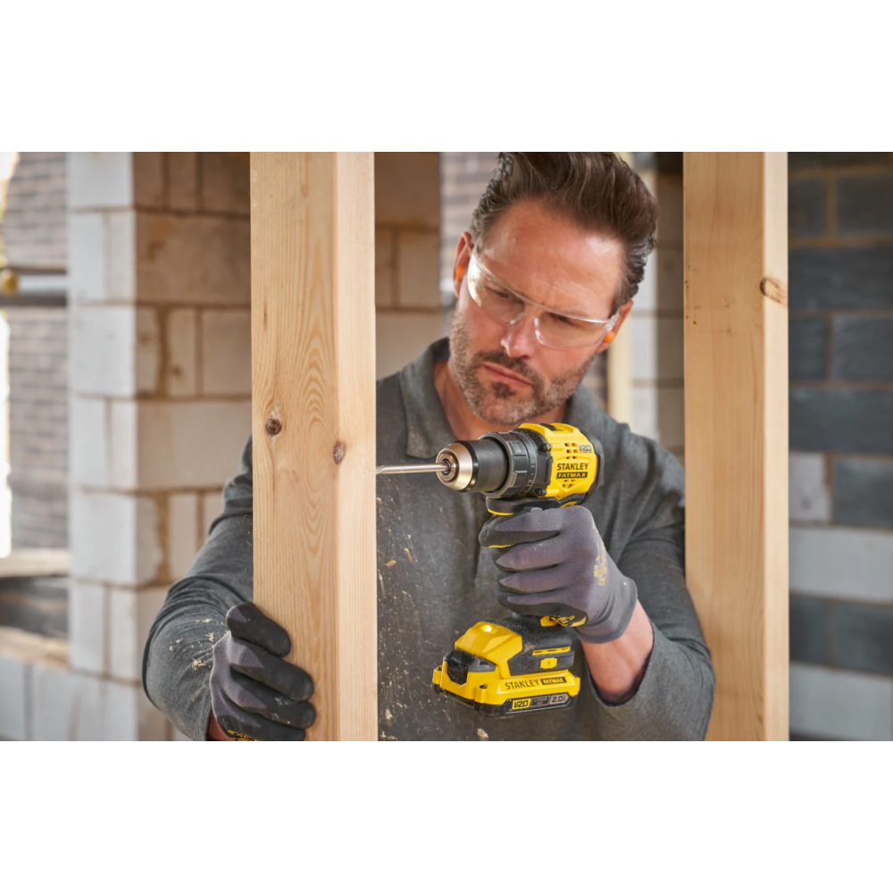 SFMCD714D2A Stanley FATMAX akumuliatorinis smūginis gręžtuvas–suktuvas, sukurtas darbui tiek statybose, tiek dirbtuvėse ar pažangiems projektams.