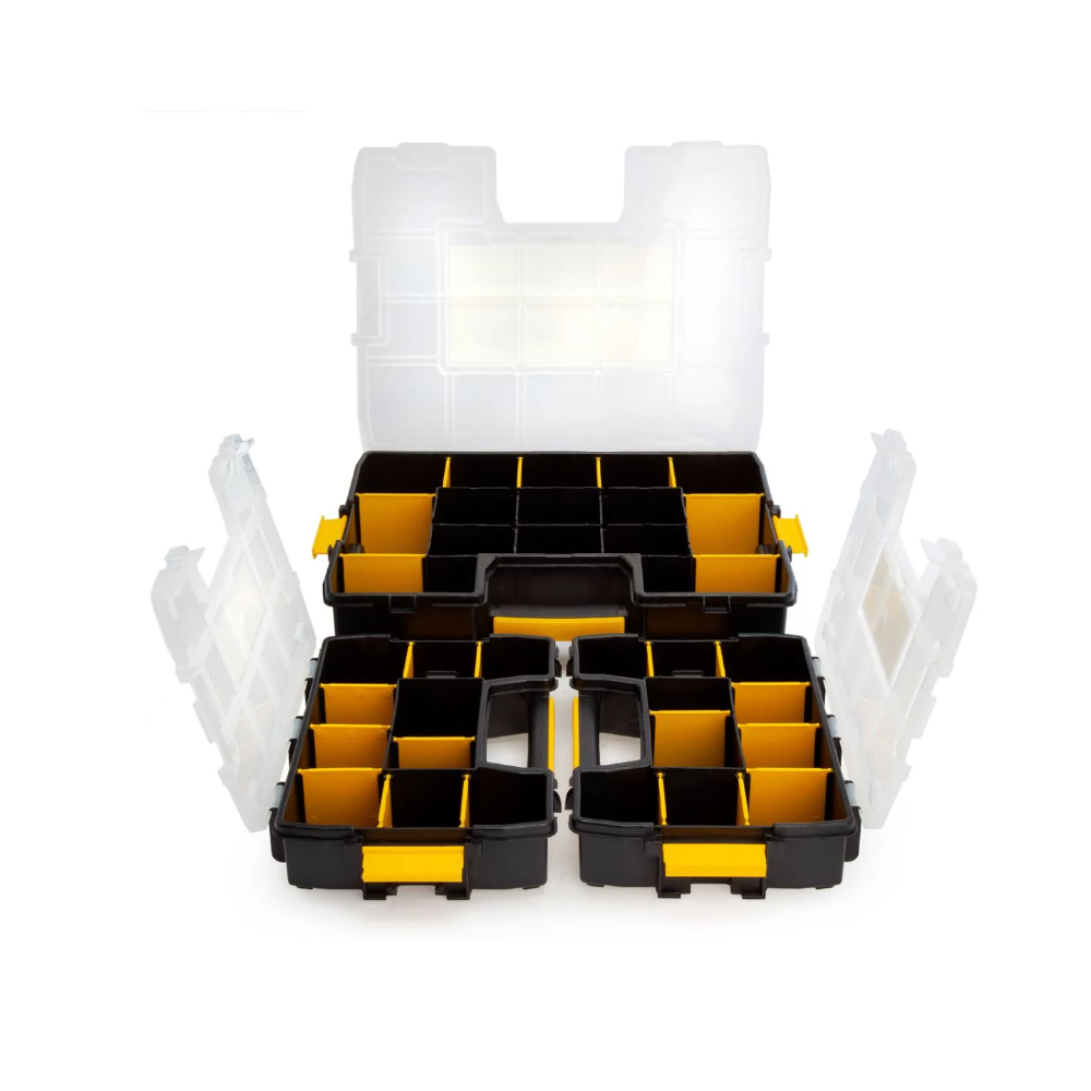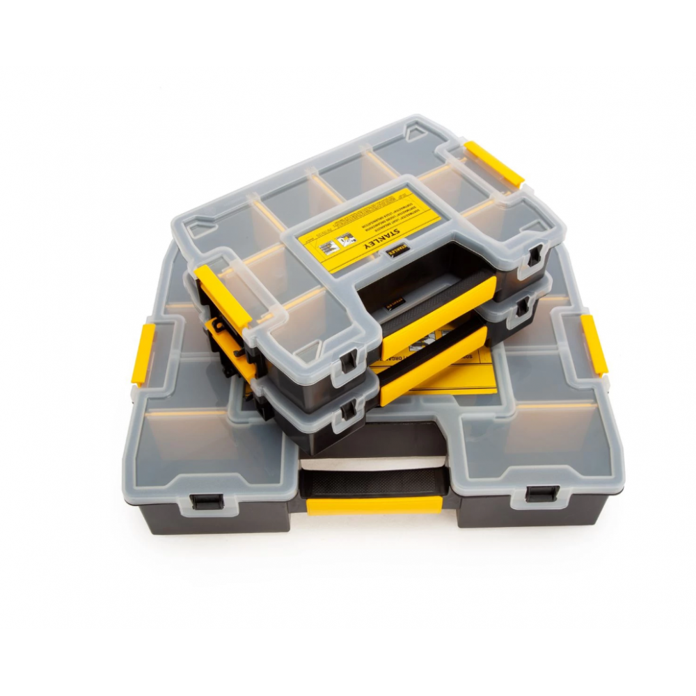 Stanley STST1‑71980 yra trijų organizatorių rinkinys: 1 didelis ir 2 maži organizatoriai, pagaminti iš tvirto plastiko su permatomais dangčiais, leidžiančiais greitai surasti reikiamus daiktus. Visi organizatoriai turi suklijuojamus dangčius su užrakinamais plastikais skląsčiais bei patogias nešiojimo rankenas.