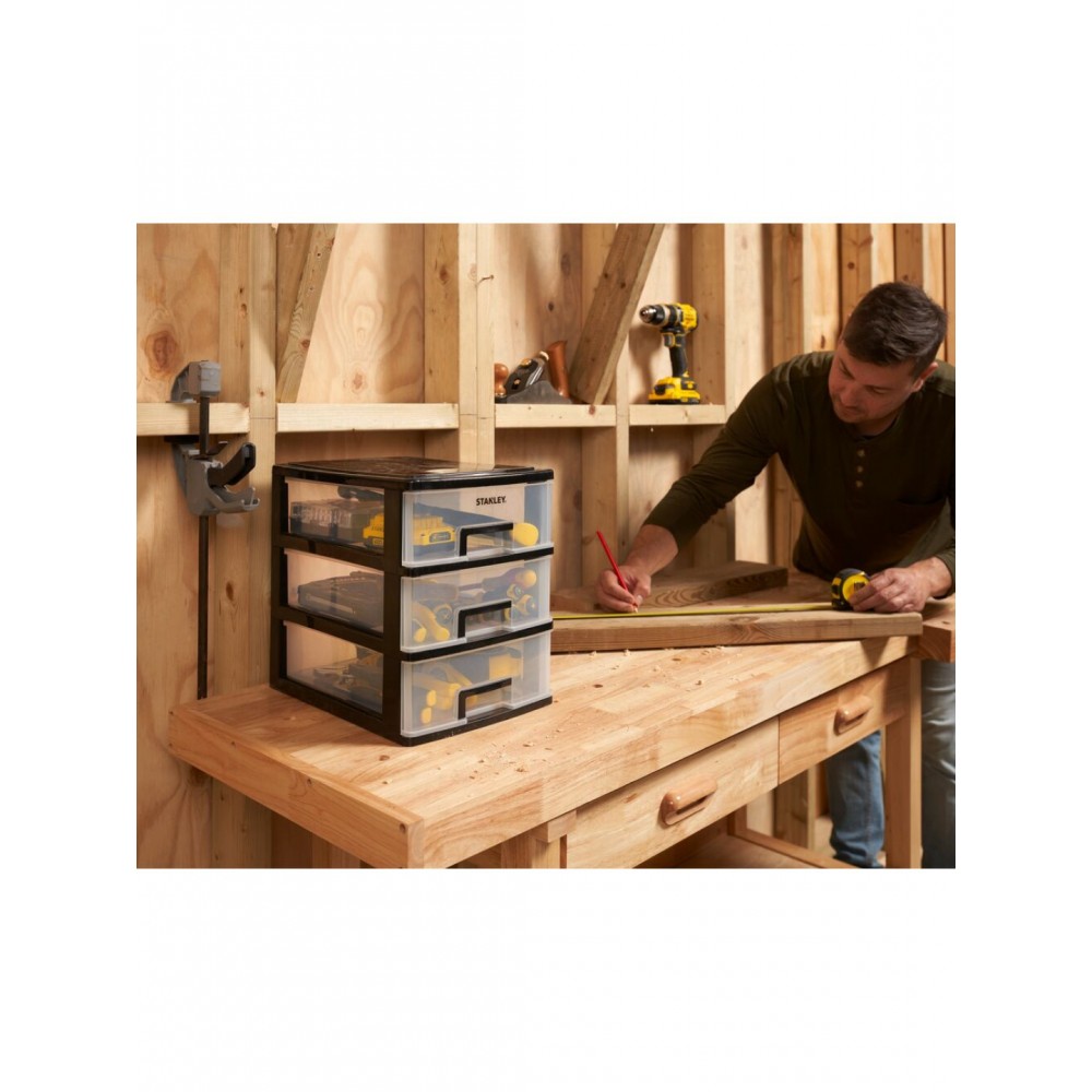 Ši kompaktiška ir lengva spintelė turi 3 permatomus stalčius, todėl iš karto matysite, kas juose yra, o išimami stalčiai leidžia patogiai pasiekti visus smulkius elementus. Tvirta polipropileno konstrukcija užtikrina ilgalaikį naudojimą, o kompaktiški matmenys leidžia laikyti stalčius tiek dirbtuvėse, tiek garaže.